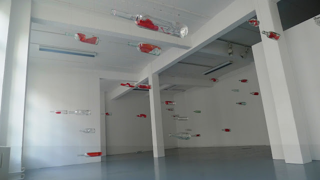 Installation with 41 glass bottles, cellophan, dermatograph, marker and fish line